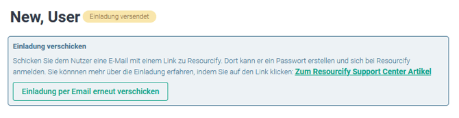 - After you have clicked on “Save”, you will see the status “Not yet invited” in the new profile as well as the note: “Send invitation - Send the user an e-mail with a link to Resourcify. There they can create a password and log in to Resourcify. You can find out more about the invitation by clicking on the link: Go to Resourcify Support Center article” and the ‘Send invitation via email’ button.