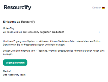 - The email sent informs you in German and English that access can be activated and a password stored using the button in the message. It also contains a note that the link will expire within 7 days, but that a new one can be requested.